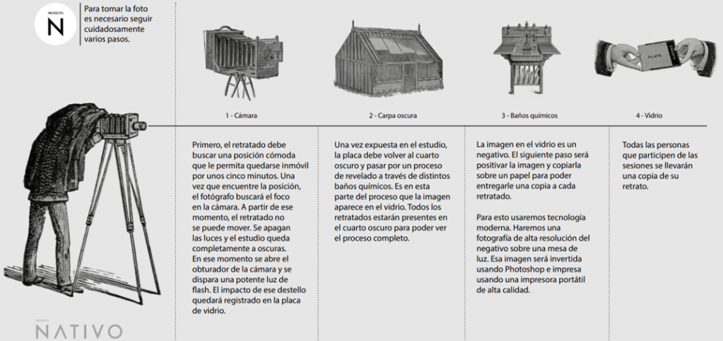 Las «placas de vidrio» son fotografías de plata y gelatina montadas sobre cristal. Esto es, el soporte es el cristal, y la imagen se forma en una emulsión de gelatina con sales de plata. El proceso se logra preparando esta emulsión fotosensible que se obtiene de la mezcla de nitrato de plata con distintas sales minerales (bromuros y ioduros). Ésta, luego de reposar unos días, será aplicada a las placas de vidrio previamente tratadas. Las placas preparadas serán usadas como negativos y servirán para retratar a los miembros de la comunidad